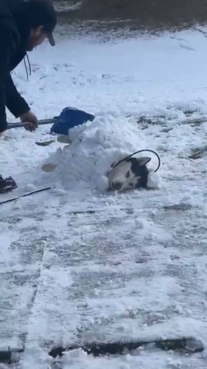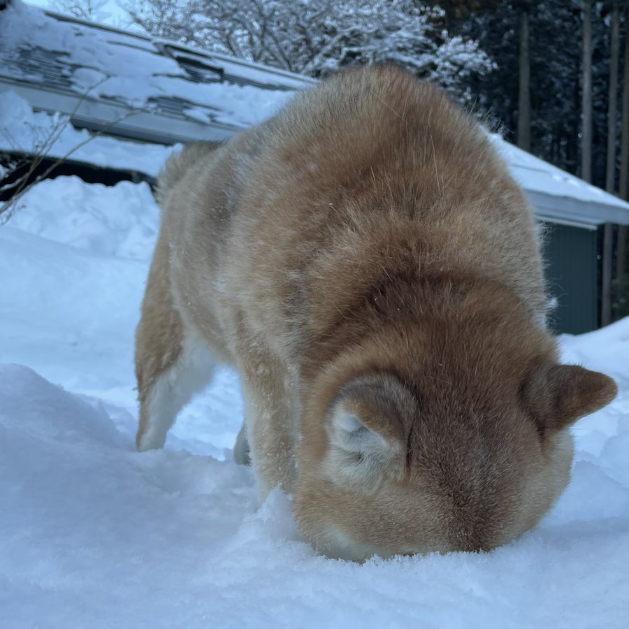 硬い毛が雪防ぐからちょっと埋もれる